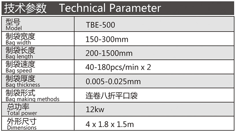 機(jī)器特性 此設(shè)備為生產(chǎn)連卷八折平口垃圾袋的專用設(shè)備,雙通道高速無拉伸底封好,收卷整齊,個(gè)數(shù)準(zhǔn)確,手動(dòng)手卷。主動(dòng)放料,薄膜張力穩(wěn)定此設(shè)備采用全鋼板一體而成,用電220v照明電即可。